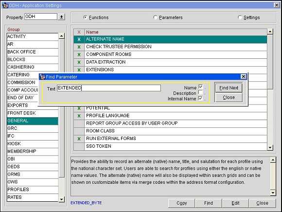 Hint: The internal name is the name OPERA uses to identify a function, parameter, or setting within the code. It may be different from the display name (Name) that you see listed in the Name column of this screen. To see the internal name associated with a display name, highlight the entry in the Name column and double-click in the lower part of the screen, to the right of the Groups list and below the Description. The internal name displays in blue text.