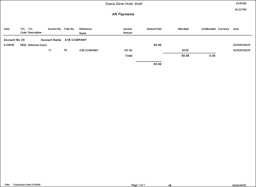 Note: This report is only available when the CASHIERING>ACCOUNTS RECEIVABLES application function is set to Y.