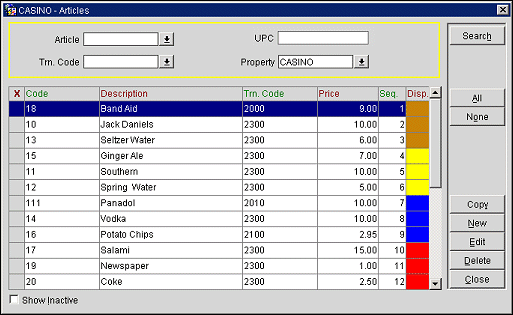Select Configuration > Cashiering > Codes > Articles to configure the transaction code Articles feature. (This feature is available when the CASHIERING > ARTICLES application function is set to Y.)