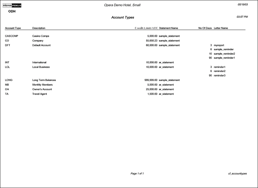 The Configuration report for Account Types will display all Accounts Receivable Account Types that have been configured for your property. The Accounts Receivable (AR) license must be active in order to configure any Account Types.