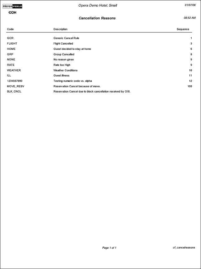 The Configuration report for Cancellation Reasons will display all Cancellation Reasons that have been configured. Cancellation Reasons are not property specific. When a reservation is canceled, the user is prompted with a single select list of values to select the reason the reservation is being canceled. When in F7 for Multi Property or ORS, the user can Move an existing reservation to another property. When moving the reservation, the user is prompted with the Cancellation Reasons List of Values to select for Cancellation of the Reservation at the existing property.