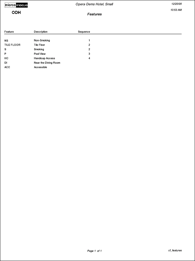 The Configuration report for Features will display the Features that have been configured for your Property under the Preference Group of Features.