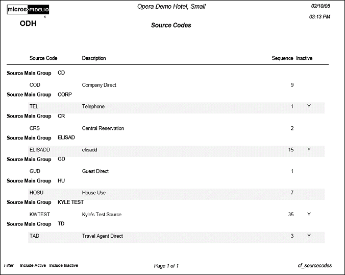 The Configuration report for Source Codes will display all Source Codes that have been configured in the application. When the OPP_MHOT Opera Property Management Multi-Property Base add-on license code is active, this report will represent all codes on the template form.