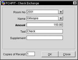 Note: If the check exchange is being handled for a passerby, tab through the Room and Name fields, leaving them empty.