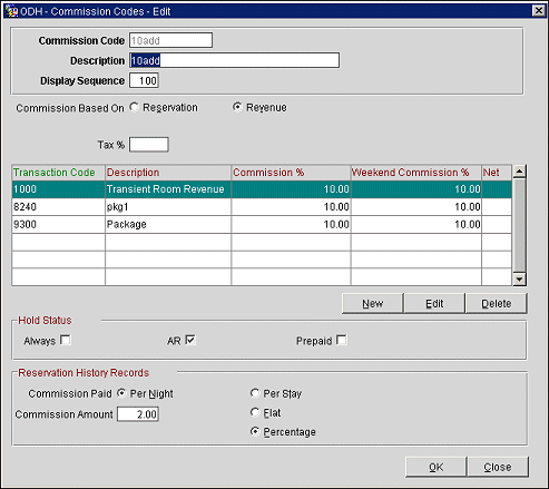 When the Commission Based On Revenue option button is selected, the Transaction Codes grid appears.