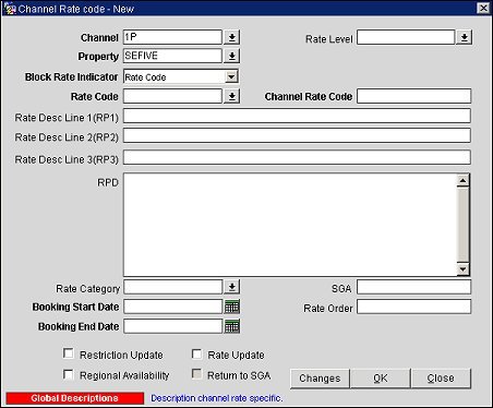 Global Descriptions. Select this button to access the Global Channel Rate Code Descriptions screen and enter a global description for the rate code. This value is automatically updated by OPERA.