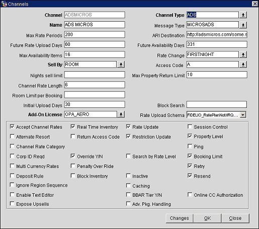 Real Time Inventory. (Only displayed when channel type is ADS) Select to send a booking limit message to the channel whenever there is an inventory change. When unselected, messages will be uploaded by MICROS ADS Booking Limit service at intervals specified in the service.