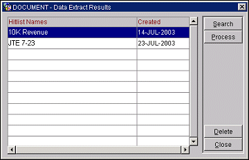 When you save the data extract query results, you are asked to provide a unique name for the query results. You may then access these query results at a later time from the Extract Results screen. To access the Extract Results screen, select Miscellaneous>Data Extraction>Extract Results.