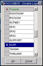 You may prohibit logins to a property by selecting Utilities>Property Config>Disable Property Login . This option is useful whenever there is a need to keep others from logging into the property, for example during maintenance, upgrades, etc. When the Disable Property Login option is selected, you are presented with a multi-select list where you can choose the properties for which new sessions should be prevented.