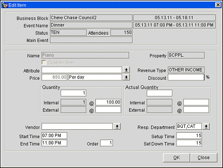 In some situations it will be necessary to edit the details of an item that has been selected for an event to make it fit the client's specific requirements. Changes can be made to the item price, the item quantity, and other details. The Edit Item screen will also allow the actualization of the item on the resource level once the event becomes actual.