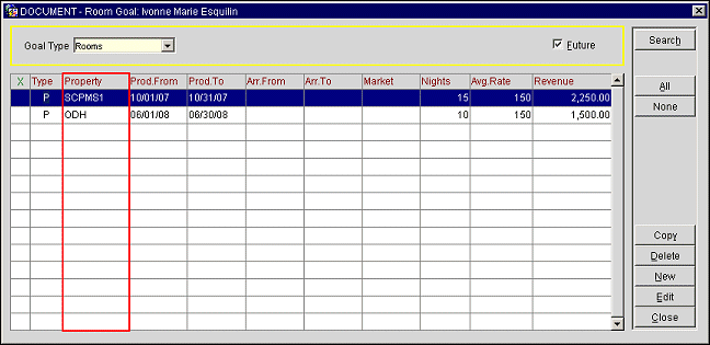 Note: The goals that display on this screen pertain only to the application user's default property when this screen is accessed from Configuration > Setup > User Configuration > Users. To view goals or create for a specific property in a Multi-Property environment, you must access this screen via Configuration > Users > Sales Manager Goals > Edit or New. From there it is possible to edit, create and view employee goals across multiple properties by using the Property LOV that displays on the Sale Manager Goals screen. See Creating and Editing Goals in Multi Property for more details.
