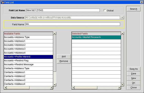 Select Save to save the field list in the Selected Fields list under the name shown in the Field List Name field. You can create several field lists, each with different choices of fields, while working with this one data source. To do so, use the Save As button to save each collection of fields in the Selected Fields list under a different name.