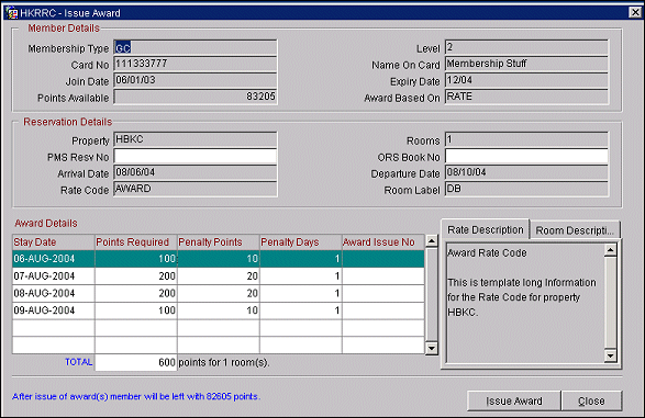 The Issue Award screen displays the total number of award points required per stay date and the penalty if canceled. Additionally, the screen displays the total number of points required for the entire stay (if multiple nights). At the bottom of the screen is a message, highlighted in blue, that reminds you of how many points remain for the member after the award is issued.