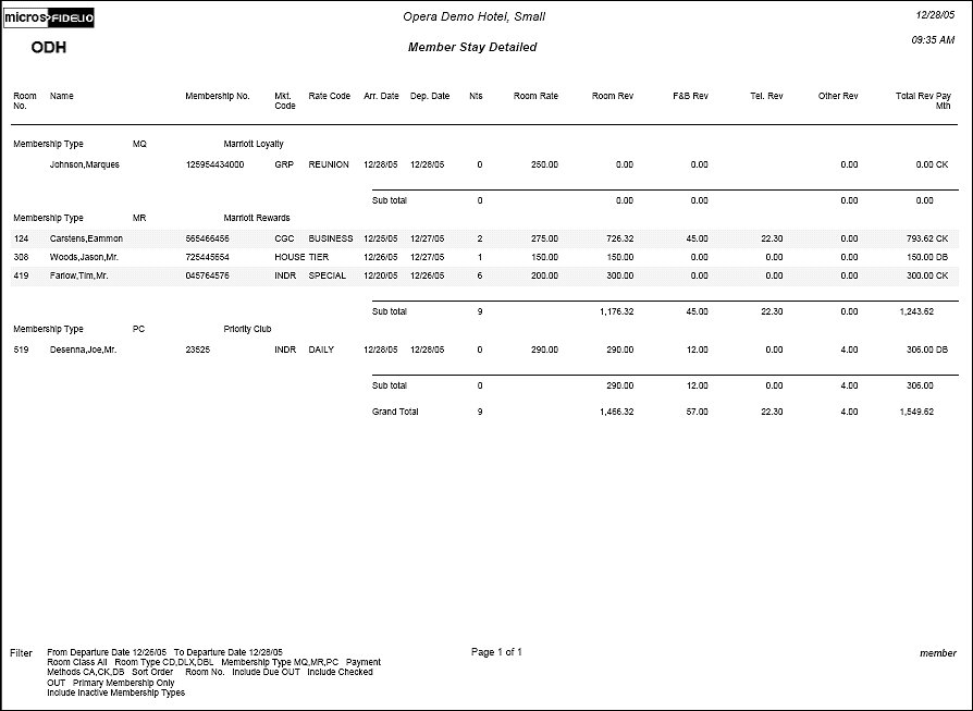 Membership Type. Type comma separated Membership Type entries or select the down arrow and choose from the multi-select LOV to filter on Reservations with a specific Membership Types attached to the Reservation. This filter does not look at the Memberships attached to the Profile. The report will include only those reservations that have the selected Membership Types attached. The default is ALL Membership Types.