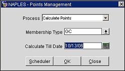 By selecting Membership>Calculate Points, at the Points Management screen, you can run batch processes for: