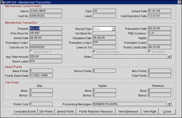 Computed Points. Displays the points originally calculated for a transaction flagged as a membership transaction exception. These computed points can be compared to the points actually granted, denied, or adjusted. This button only appears when the Membership Parameter>Membership Exception is enabled and if the transaction was flagged as an exception.