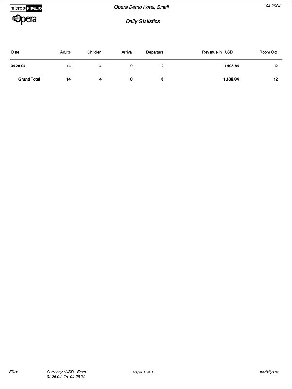 The Night Audit Daily Statistics Report displays a brief summary of guest statistics for room occupancy and revenue. It is considered a summary version of the more detailed Manager's Report.