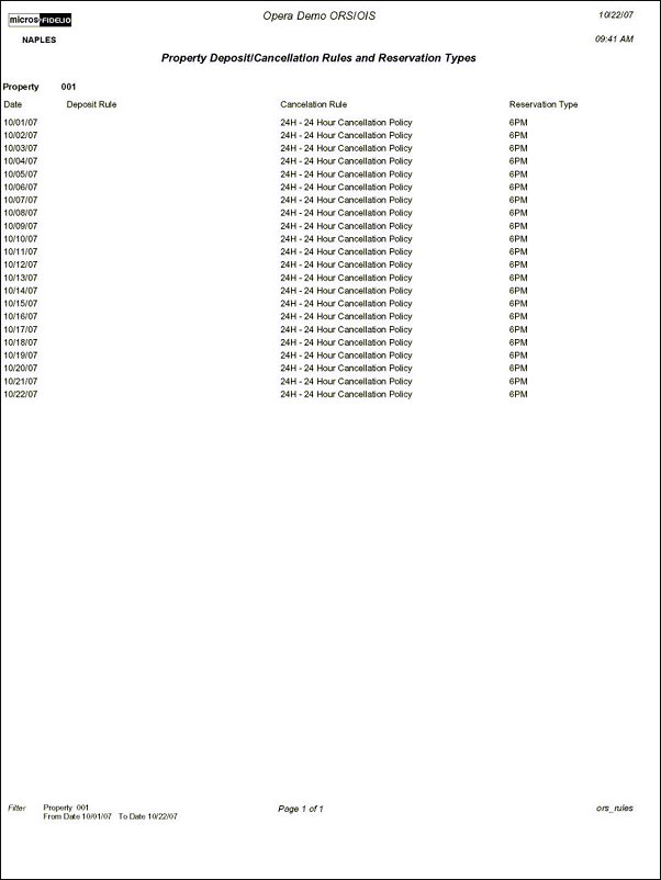 This report displays deposit rules, cancellation rules, and reservation types for selected properties in the CRO database. Users select the date range for which to include the information.
