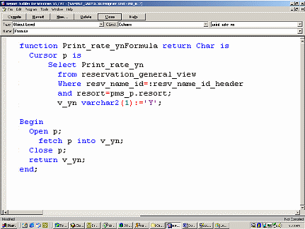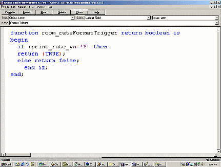 Select the field referencing Rate Code whether this is a merge code or just the field name. Press F11. This will place you in the PL/SQL Editor. Place the following code in between the begin and end commands.