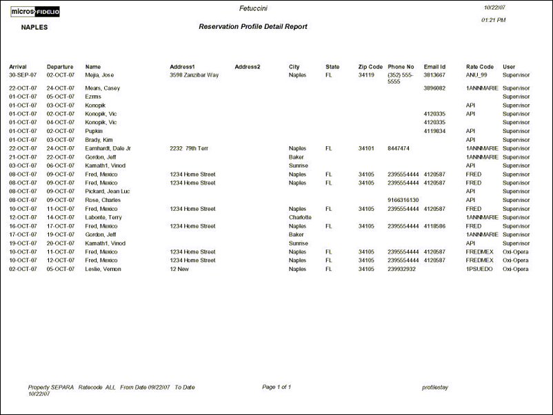 The Reservation Profile Detail Report displays information about Reservations (arrival, departure and rate code), Profiles (name, address, phone) and Application user.