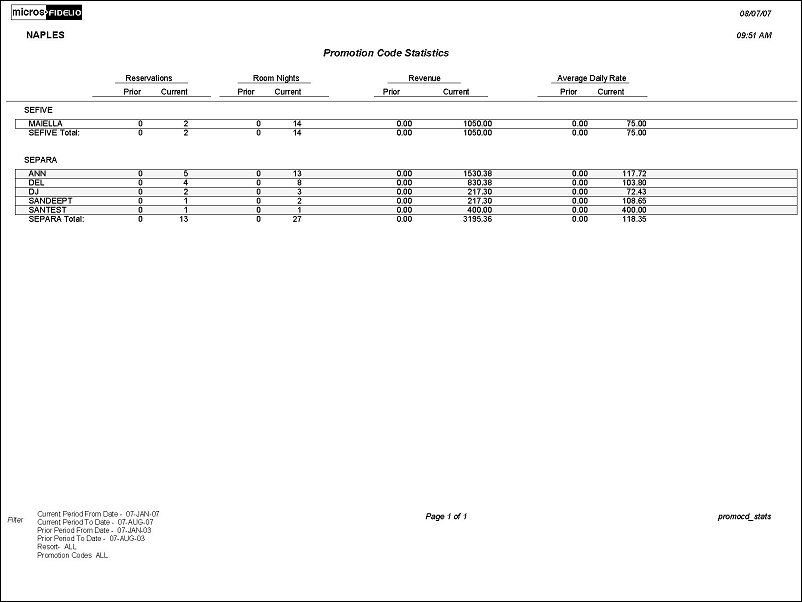 This report displays reservations at properties having promotion codes associated with them. Users may select the property, promotion code, and dates of the reservations to compare previous and current promotion code activity. The report is organized by prior and current reservations, room nights, revenue, and the average daily rate.