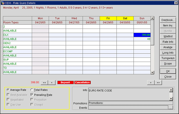 The Rate Query Details screen displays the prevailing rates for the guest's requested arrival date, plus 3 days prior to and three days following the arrival date. (If there are fewer than three days between the proposed arrival date and the current business date, rates will be shown for something less than three days prior to arrival. For example, if the current business date is 01/01/09 and the proposed arrival date is tomorrow, 01/02/09, rates for only one day prior to the requested arrival date would be shown.)