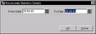 Date ranges entered should not be equal to or greater than the business date for the property. When the date range is entered, select the OK button to recalculate the statistic details for everyday in the date range.