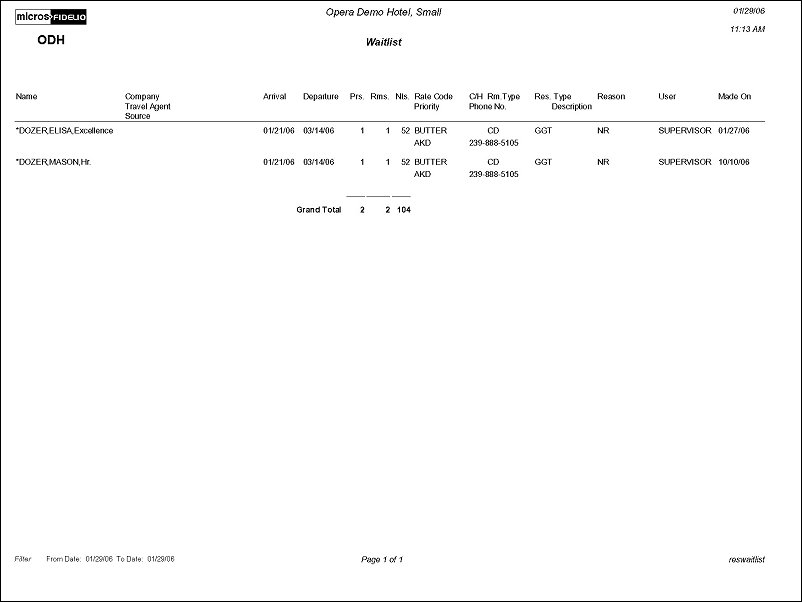 The Reservations Waitlist Report displays details about guests whose reservations cannot be made because of lack of availability. If there is a fall out in reservations, waitlist guests can be moved to the reservations file. When rooms become available, Front Office managers can print this report to review a list of waitlisted reservations to determine the number of potential reservations that are able to generate maximum revenue, and can be moved to the active reservations list.