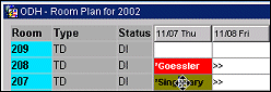 Type the new room number directly in the Room field of the grid. For example, if you wanted to assign room 506 instead of 505, type 506 directly in the Room field.