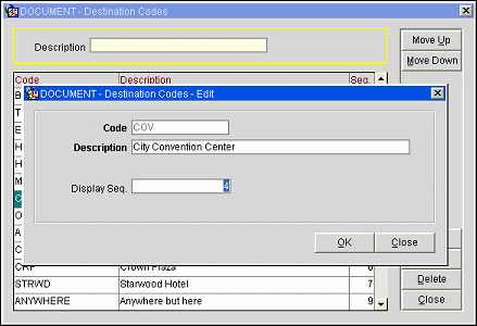 From the Destination Codes  screen you may add new destination codes and edit existing destination codes. To add a new destination code, select the New button. To edit an existing destination code, highlight your choice and select the Edit button. The Destination Codes - New or Destination Codes - Edit screen appears.