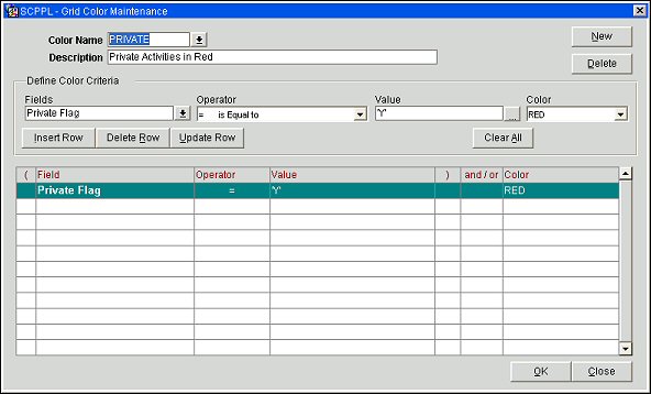 These fields allow you to create a SQL query statement that will be used to determine when a particular record should be displayed in the color code you are configuring.  You can set up multiple statements connected by AND, or OR operators. As each statement is created, select the Insert Row button to add the statement to the grid. If you are using multiple statements with AND/OR, add parentheses as needed by clicking in the ( and ) fields in the grid.