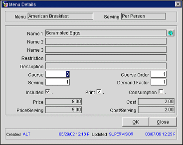 Name 1, 2 and 3. Menu item names. View only. Set up in Menu Item Maintenance (Configuration>Catering>Menu Item Maintenance). See Menu Item Configuration - Menu Item Name Grid for details.)