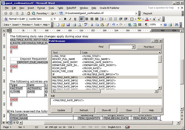 The Stationery Editor utilizes the technology of Oracle BI Publisher. The Reports stored data and the report display are separated (as opposed to using Oracle Report Builder). Microsoft Word will be used to customize layouts in RTF format, which will be converted into XSL-FO and then merged with XML data to generate final documents in PDF, HTML, or RTF format within OPERA.