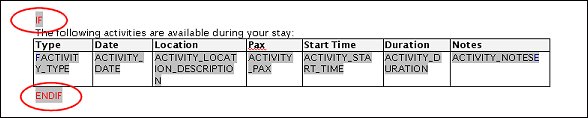 Notice that IF statements appear throughout the document template. IF and ENDIF represent the IF and END IF statements provided with the sample reports. All data contained within the IF to ENDIF statements will only display based on the conditions of the IF statement being met. For instance, if a guest has a reservation where a deposit is not required for their stay the IF statement suppresses the field DEPOSIT_DUE from displaying on the confirmation.