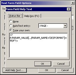 Viewing and/or editing the condition of an existing IF statement can be done one of two ways. First, double-click on the field for the IF statement you want to modify. This displays the Text Form Field Options screen. Select the Add Help Text button. The Form Field Help Text screen displays. From here you can manually edit the IF statements to suit your requirements.