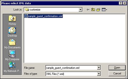 Select the XML data to load for the report you want to customize from the Customize directory. The XML file should be the sample_xxx that corresponds to the report you are customizing. For example, if you are creating a confirmation letter for your resort, and you have named it ‘world_confirmation’, you will not see an XML corresponding. You should select the file sample_guest_confirmation.xml to load the available elements for customization.