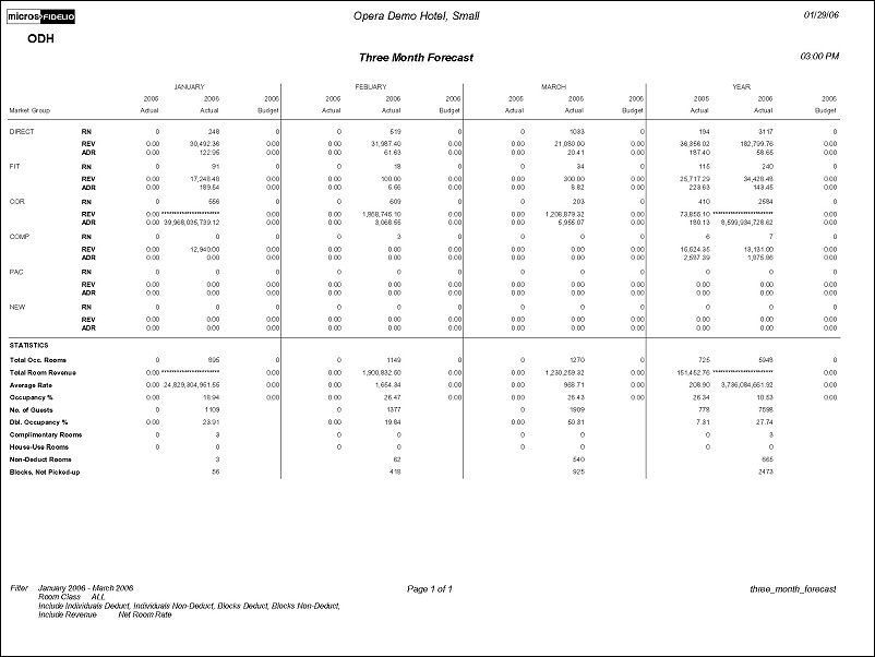 The Three Month Forecast is a three-month outlook report based on the number of room nights, room revenue, and average rate per market main group per month. The report can only be printed for three months at a time and can print either forecasted or statistical happenings. The report shows the actuals for last year, actuals or forecast for this year, and the budget for last year. You can include individual reservations that are deduct or non-deduct, block reservations (blocked and picked up) that are deduct or non-deduct (not including block rooms when the block status is INQUIRY, REGRET and LOST), and revenue figures. If you include revenue, you must choose whether to show the net room rate or the package room rate.