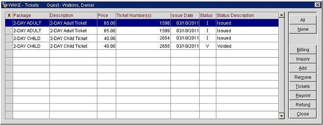 Tickets. Available when the tickets have not been printed yet, select to send an add request to the ticket vendor for the selected ticket package to be printed. The ticket vendor creates the ticket numbers and a print command is then sent to the property so the tickets can be printed for the guests.