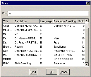 Each individual profile and contact profile contains a field for the person's Title (e.g., Mr, Mrs, Herr, Dr, etc.) on the Profile screen. The titles available when you select the Title field down arrow on the Profile screen depend on the language selected for the profile in the Language field. In other words, if you select E, for English, the available titles might be Mr, Mrs, or Ms. If you select F, for French, the available titles might be Mlle, Mm, or M. Additionally, when you select the title, a pre-configured default salutation for guests having that title appears in the Salutation field. For example, if you select the title "Mr" for Michael Summers, the default salutation might be "Dear Mr Summers." The default salutation can be edited for this profile directly in the Salutation field.