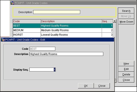 Note: When configuring Unit Grades, OPERA orders the Grades by sequence number, assuming the lowest sequence number is the highest/best Grade.